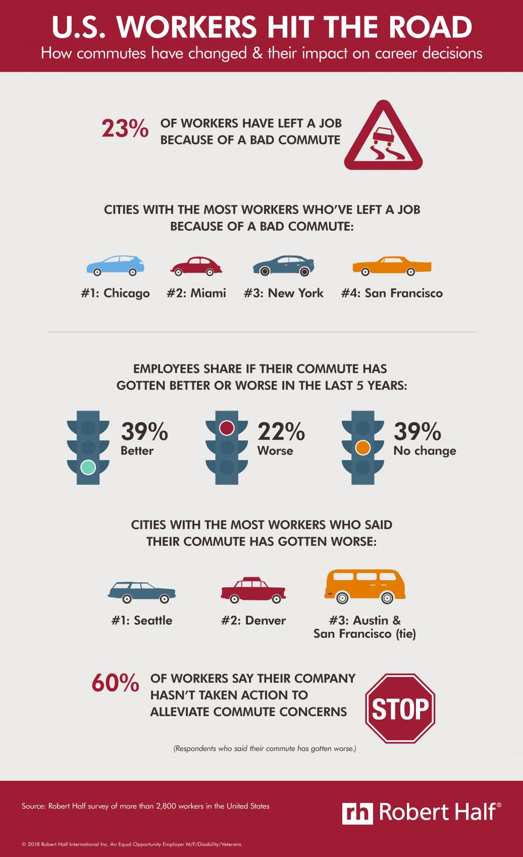 Robert Half discovered that nearly one in four of the workers surveyed have quit at least one job during the course of their careers because of inordinately long or difficult commuting times. And among the 28 urban markets studied, the highest incidence of changing jobs because of a problem commute were for workers residing in the Chicago, Miami, New York and San Francisco metro areas.