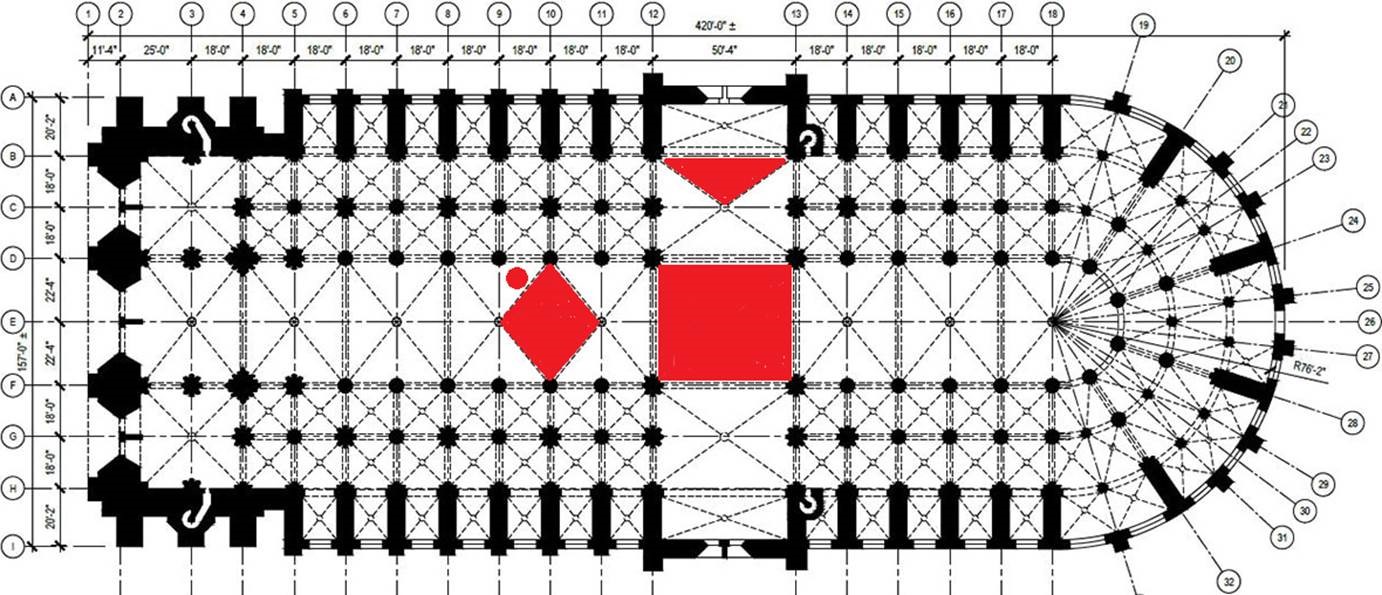 At first I thought that only about 25% of the high vaulting was gone. A more precise figure would be 32% of the high vaulting. Specifically, the total floor area (not surface area) of the high vaults was about 19,830 square feet of which approximately 6,260 square feet (31.6%) no longer exists, based on the plan shown below. The red areas depict the high vaults which fell.