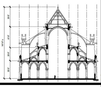 The roof above the high vault, and the attic it encloses, will of course need to be completely rebuilt. Here I think the restorers will design and build a replacement that’s similar in appearance, but structurally very different from the one that burned. For example I should think they would want to use structural steel instead of oak framing, for fireproofing (not to mention the difficulty of finding enough virgin oak trees to duplicate the original timber). The original tile cladding was lead which is quite toxic, so I suspect the new cladding will be made of a completely different material such as copper. These changes won’t really affect the cathedral’s architectural integrity, because the old attic was visited very rarely, and cladding material such as copper eventually weathers to about the same color as lead.