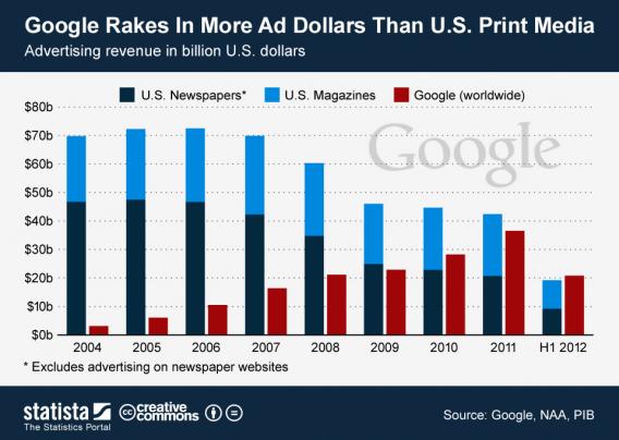 That is correct: German-based statistics portal Statista reports that Google garnered ~$20.8 billion in total ad revenues over the period, while all U.S. newspapers and magazines took in only about $19.2 billion.